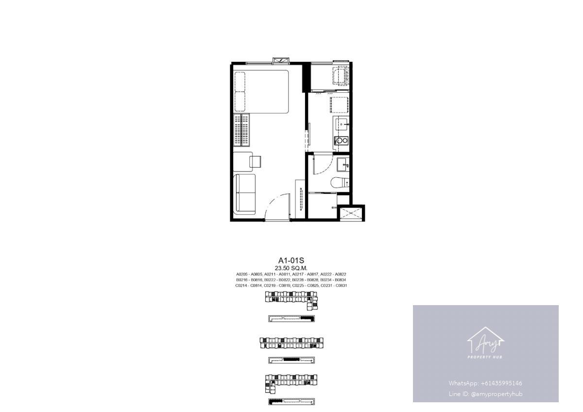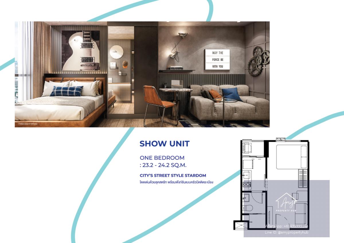 พื้นที่ใช้สอย: 23.20 ตร.ม. – 24.20 ตร.ม. (ขนาดเล็กที่สุดของโครงการ)