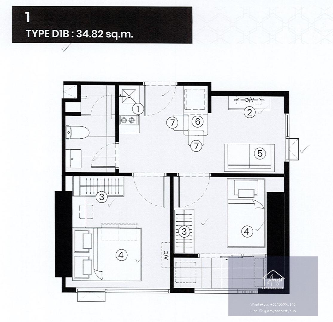 📌 ห้อง Simplex 1 Bedroom Plus | 34.67 – 34.82 ตร.ม.