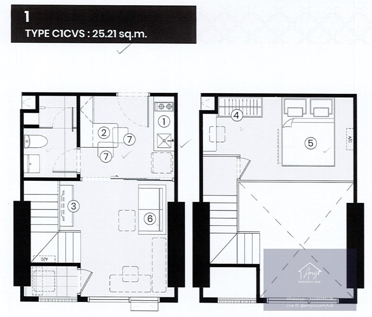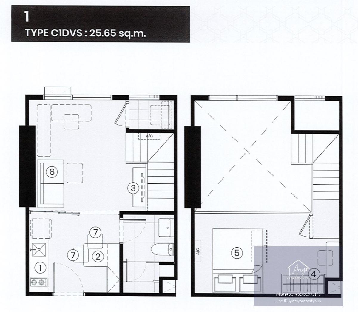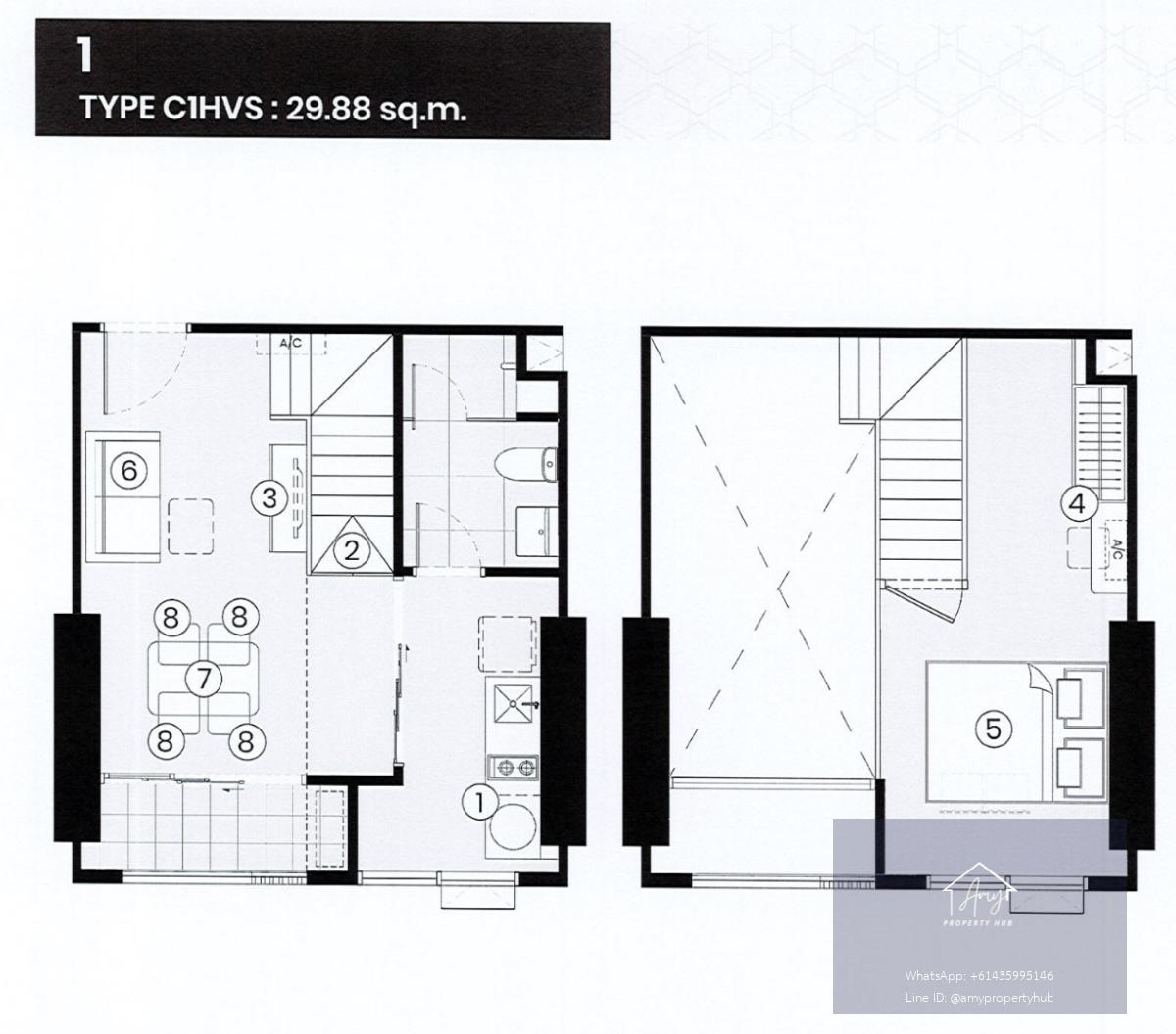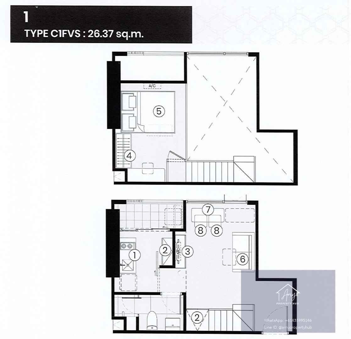 ห้องนอน/ห้องน้ำ: 1 ห้องนอน, 1 ห้องน้ำ (ชั้นล่างเป็น Living Area, ชั้นลอยเป็น Bedroom)