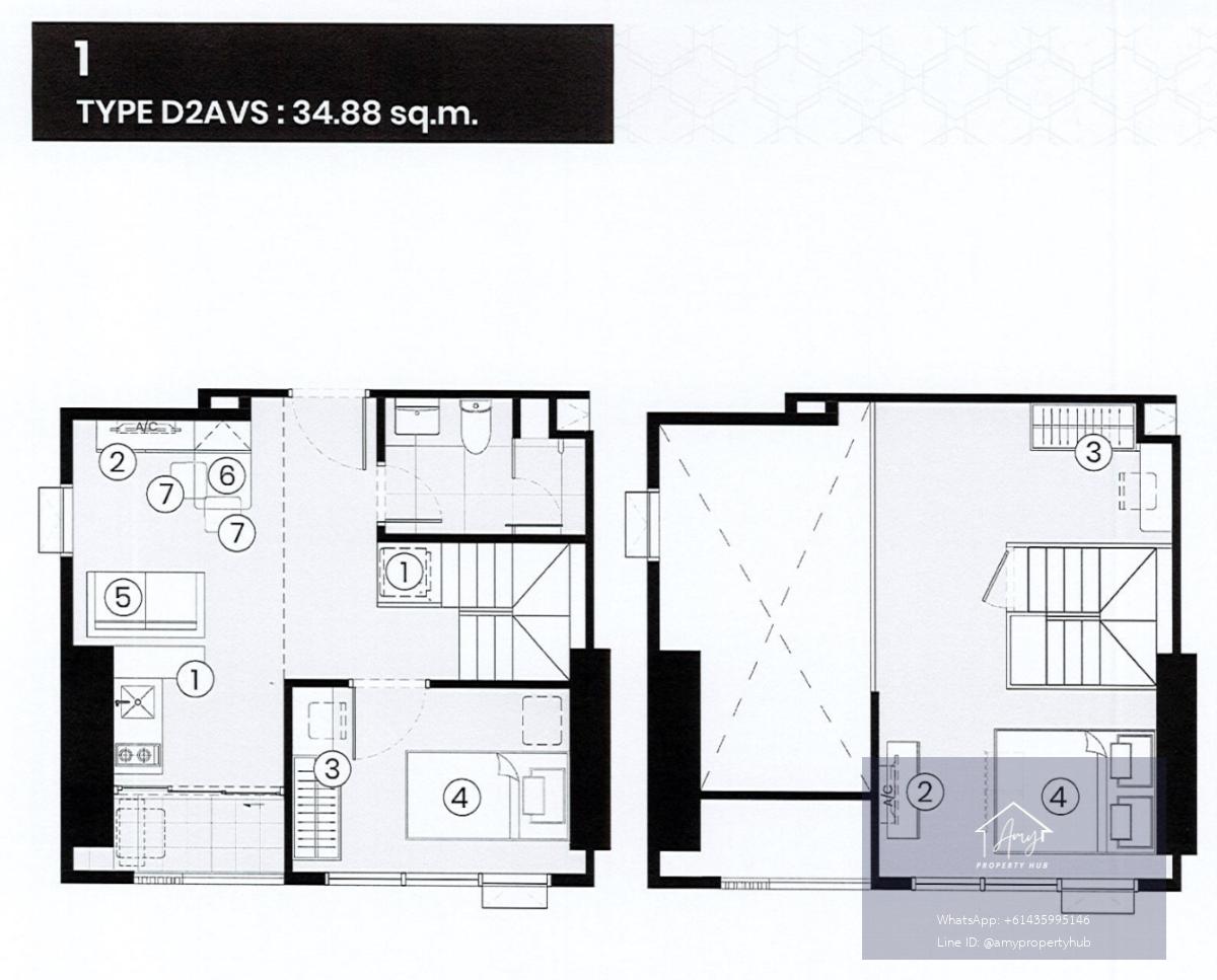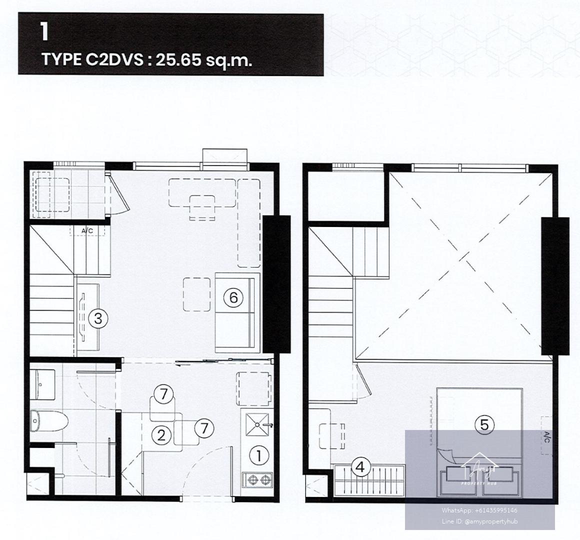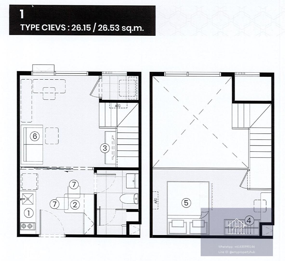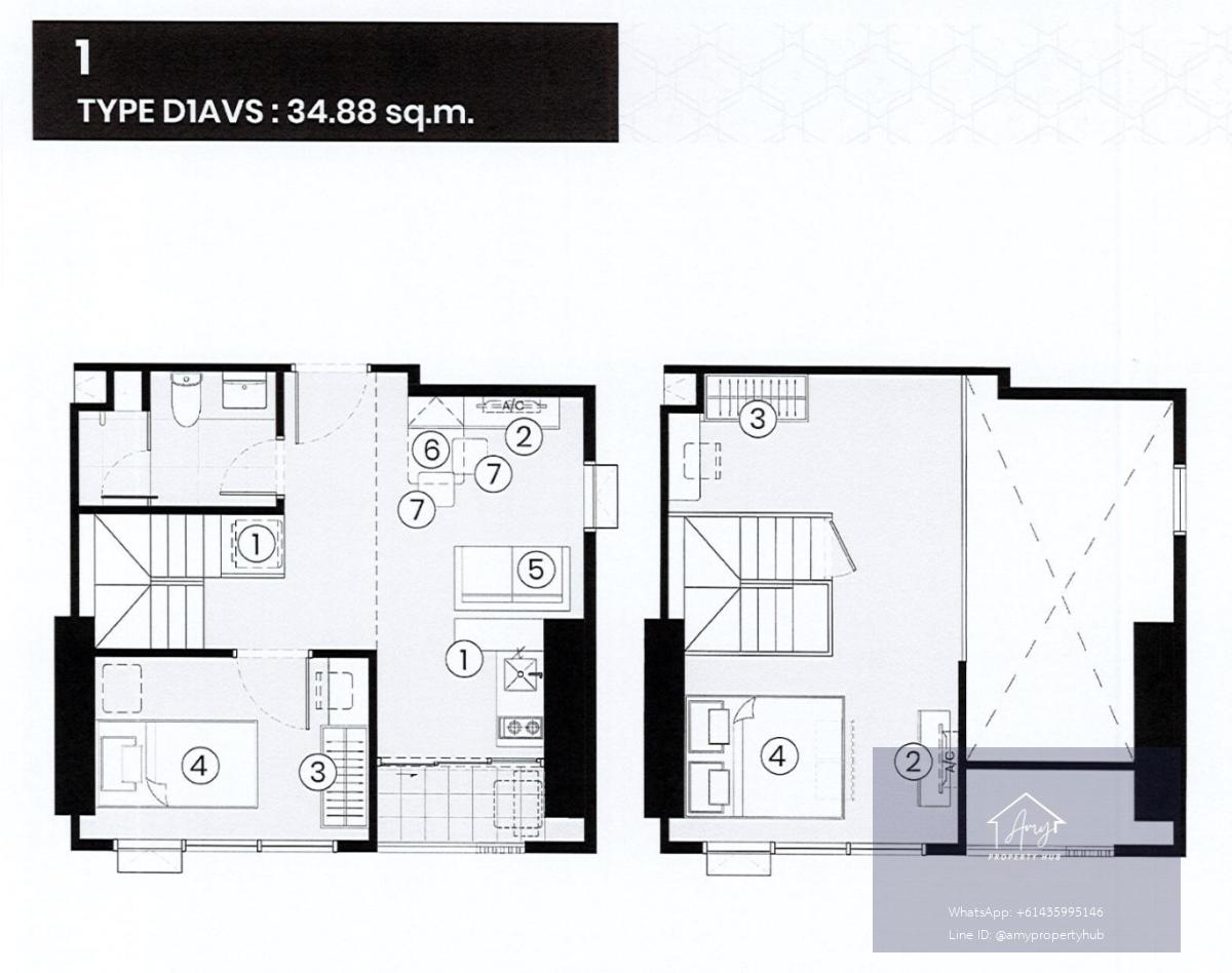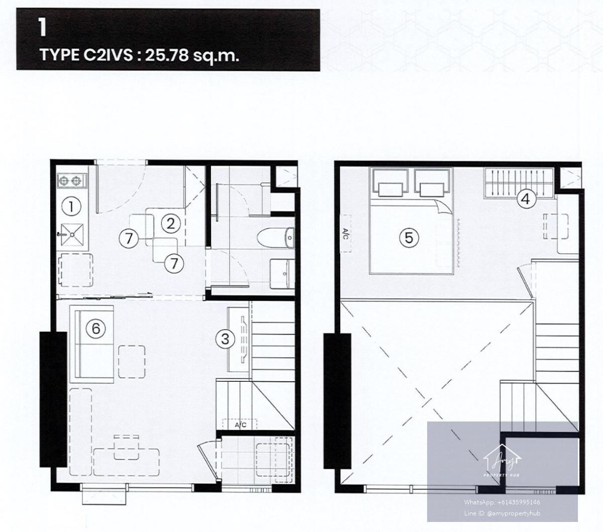 ห้องนอน/ห้องน้ำ: 1 ห้องนอน, 1 ห้องน้ำ (ชั้นล่างเป็น Living Area, ชั้นลอยเป็น Bedroom)