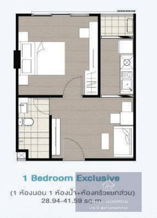 1 Bedroom Exclusive 28.94 β 41.59 sq.m. 1 bedroom, 1 bathroom (medium-sized unit with larger living/kitchen area)